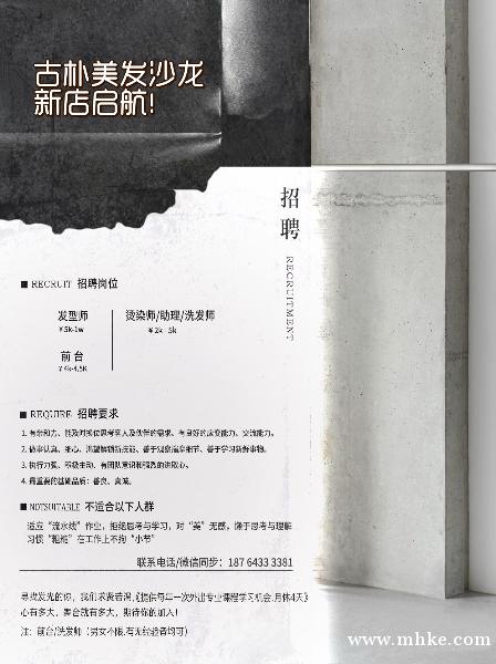 招聘:前台/发型师/烫染师/助理/洗发师/工资4000-10000.每星期二店休.详情质询请致电/面试。 联系我时,请说是在梅小网看到的,谢谢!